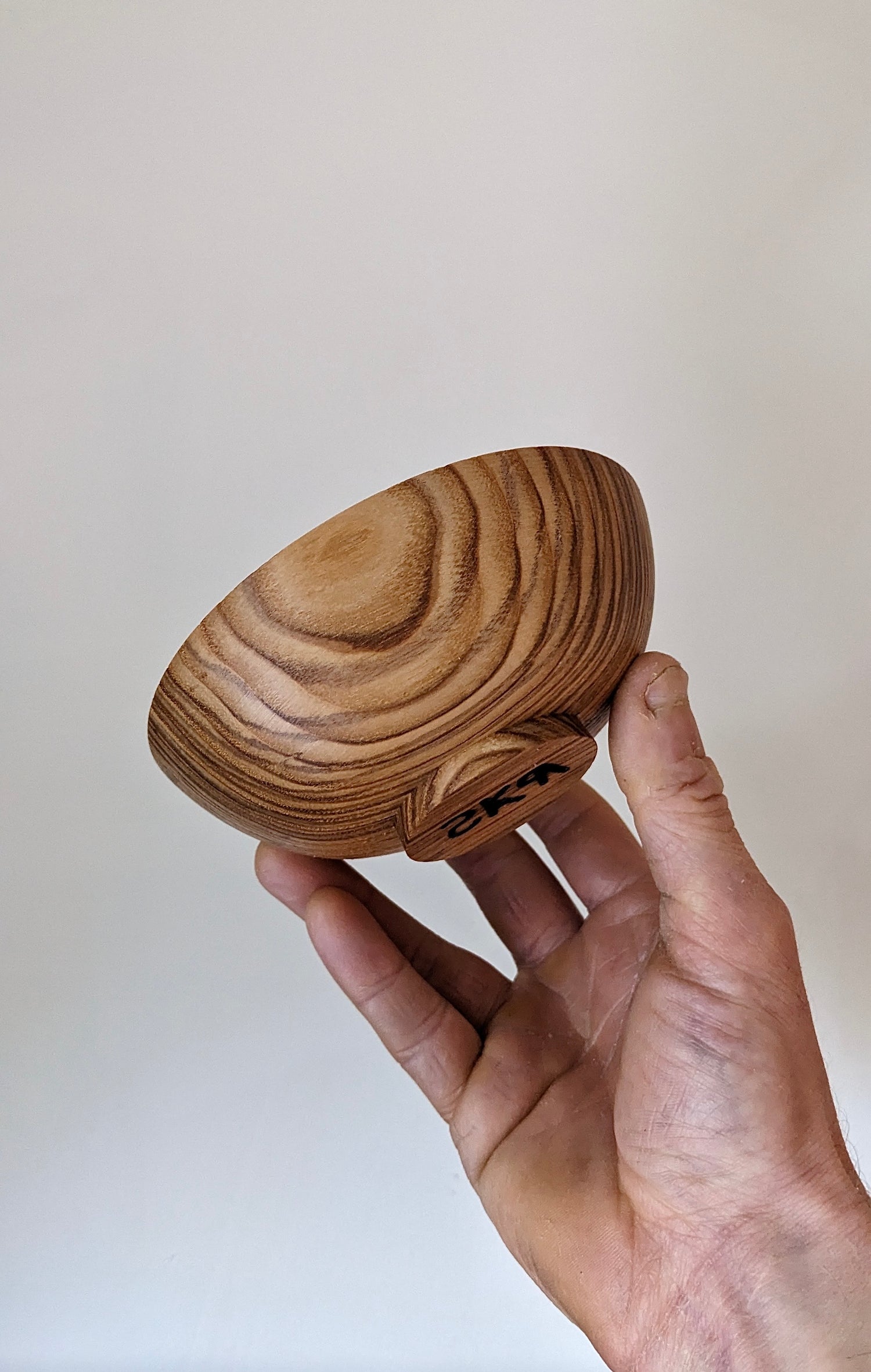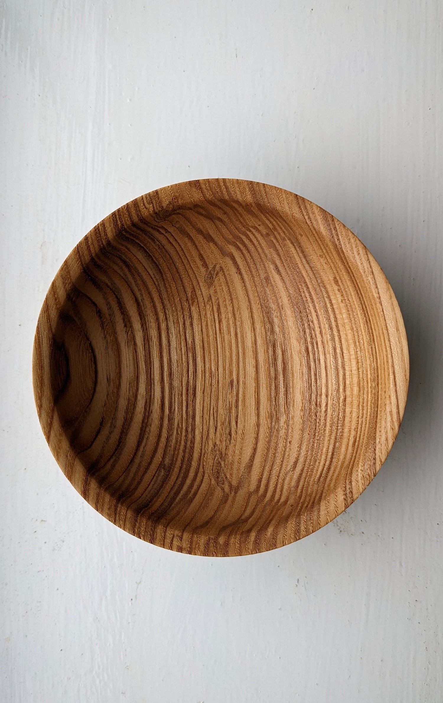 Small and cute but punching well above its weight in character. This small bowl turned from English ash boasts swirly caramel grains of heartwood that flow in mesmeric waves across its simple form.